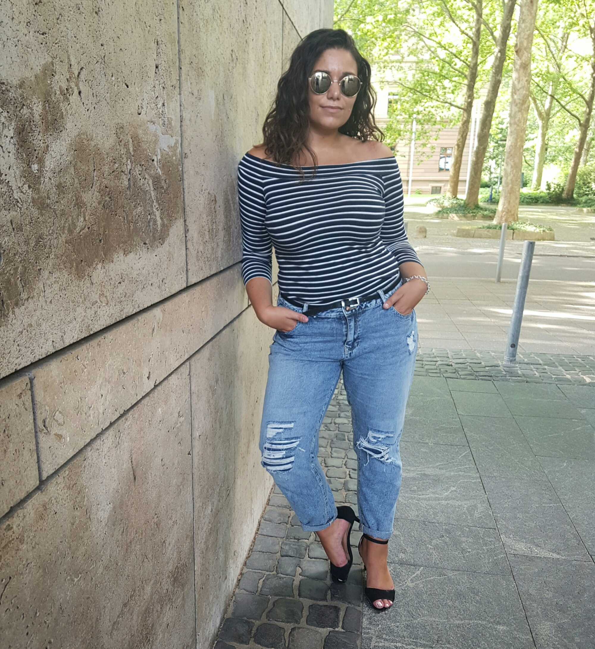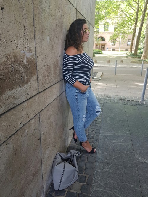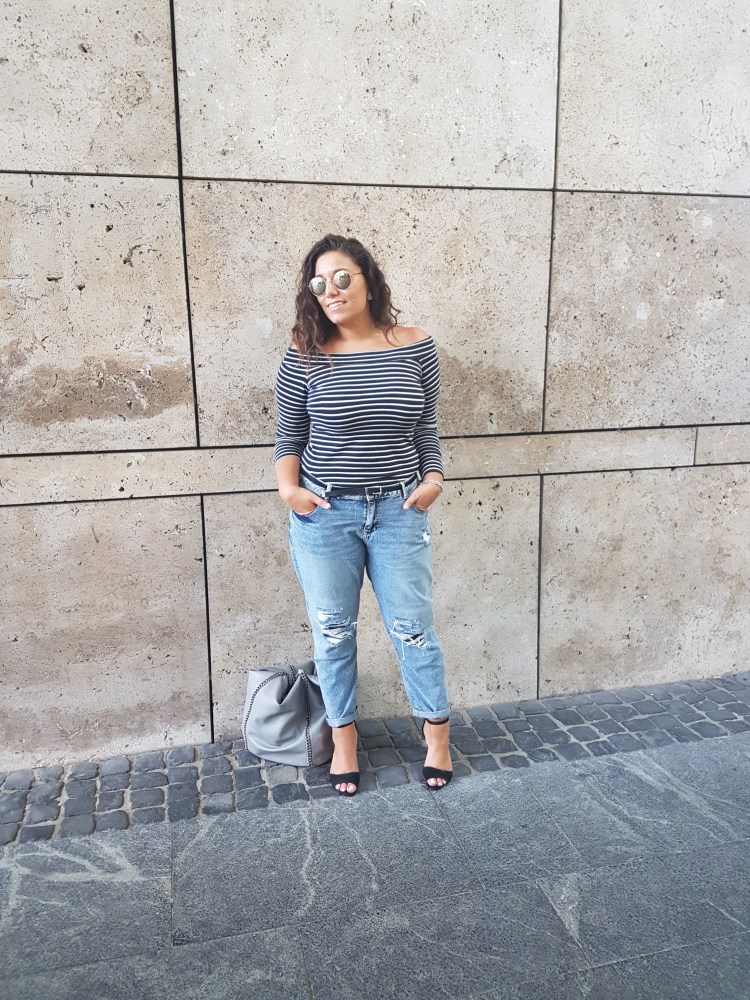 This destroyed boyfriend jeans was a great shop from Primark! One of my favorite looks are this jeans, destroyed in 90 ’s style with a shoulderfree amd curvy top and this (very important ;-) ) sandales !I love this jeans so much, there are very comfortable 😍
